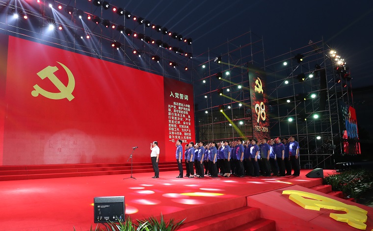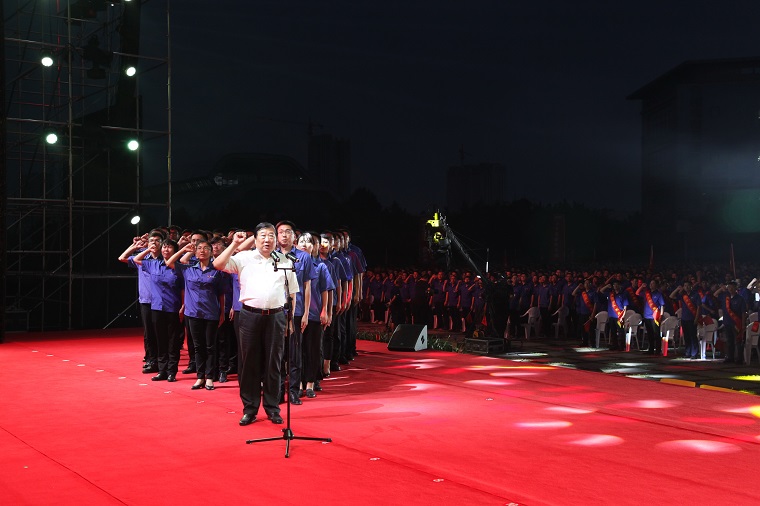 山東重工集團(tuán)黨委書記譚旭光帶領(lǐng)預(yù)備黨員,面向黨旗,舉起右拳,莊嚴(yán)宣誓,現(xiàn)場全體黨員同時(shí)起立,重溫入黨誓詞:“我志愿加入中國共產(chǎn)黨,擁護(hù)黨的綱領(lǐng),遵守黨的章程,履行黨員義務(wù),執(zhí)行黨的決定,嚴(yán)守黨的紀(jì)律……”莊嚴(yán)的宣誓聲響徹夜空,點(diǎn)燃了現(xiàn)場火熱的激情。